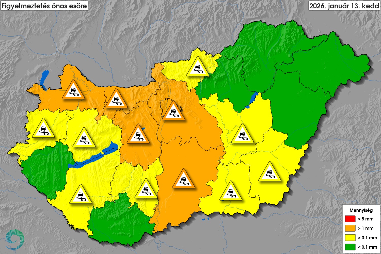 Ahol másodfokú riasztás van érvényben, ott tartós, több órás ónos esőre lehet számítani, a várt csapadékmennyiség meghaladhatja az 1 millimétert.