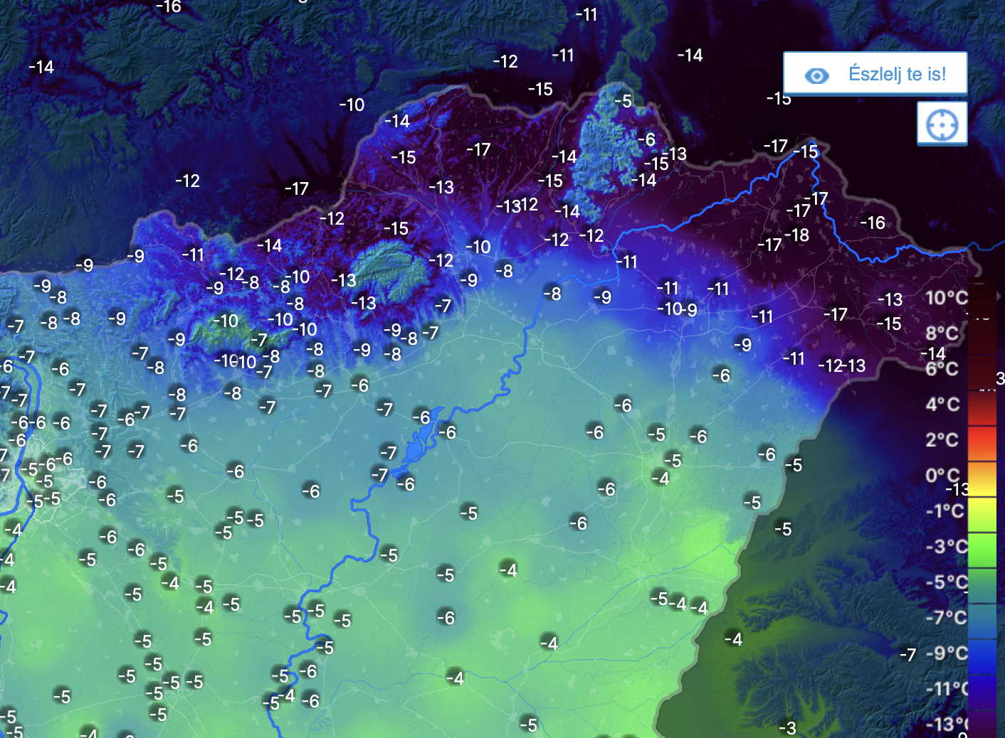 Budapest belvárosában ennél egy kicsit jobb az idő, ott hétfőn hajnalban -6 fokot mutat a hőmérő.