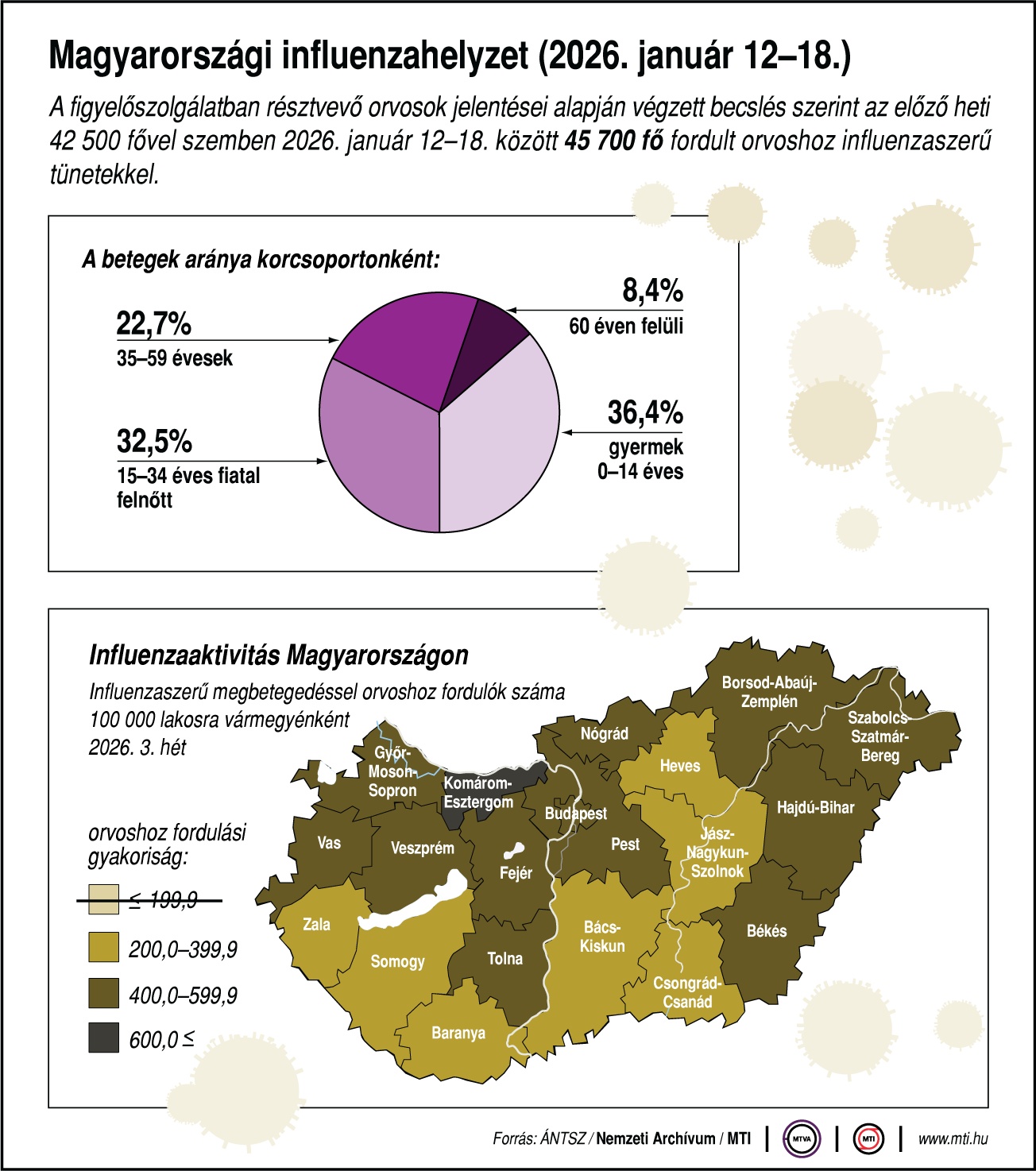 42 500-an fordultak orvoshoz Magyarországon január második hetében influenzaszerű tünetekkel. Az influenzás megbetegedések négyötödét világszerte a H3N2 vírustörzs egy tavaly megjelent, 11 mutációval bíró változata okozza.