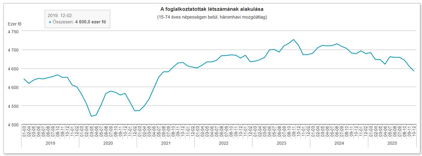 A KSH péntek reggeli jelentése szerint a 15-74 éves korosztályban átlagosan 4,642 millió volt a foglalkoztatottak száma az október-december időszakban, ami 4,5 éves mélypontnak felel meg. Utoljára ennél kevesebben ugyanis 2021 nyarán dolgoztak, 4,64 millióan. A friss adat az előző háromhavi időszaknál 13 ezerrel alacsonyabb, az előző év azonos időszakához mérten pedig 46 ezerrel kevesebb.