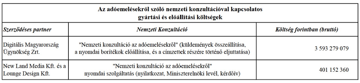 Az adóemelésekről szóló nemzeti konzultációval kapcsolatos költségekről szóló tájékoztatást a Miniszterelnöki Kabinetiroda (értsd: Rogán Antal) adta ki - vette észre a hvg.hu. Kiderül belőle, hogy csaknem 3,6 milliárd forintért szerződnek a Digitális Magyarország Ügynökség Zrt.-vel, akik a konzultációs küldemények összeállítására, a nyomdai borítékok előállítására, és ezek kiküldésére vállalkoztak, 3 milliárd 593 millió 279 ezer 079 forintért, míg a New Land Media Kft. és a Lounge Design Kft. (mindkettő Balásy Gyula cége) a nyilatkozat, a miniszterelnöki levél és a kérdőív kinyomtatását vállalta, 401 millió 152 ezer 360 forintért.