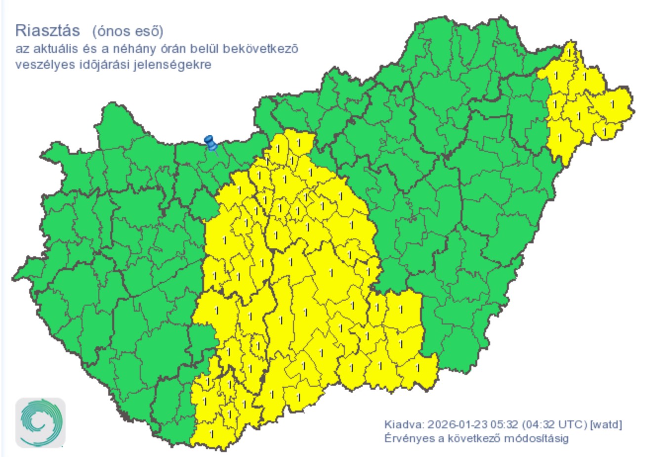 Ellenben amire érdemes figyelni: az ország közepén ék (vagy inkább kötött sapka) alakban, illetve a jobb felső csücsökben riasztást adtak ki ónos eső miatt.