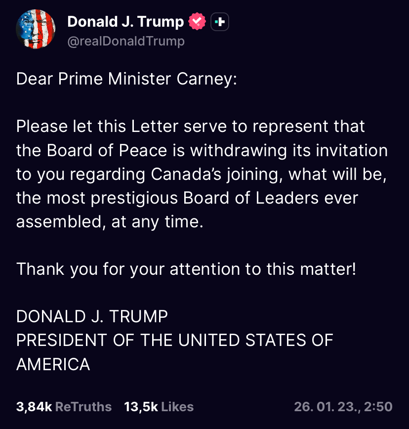 Trump Kanada meghívását azután vonta vissza, hogy Carney a davosi Világgazdasági Fórumon történelminek titulált beszédében azt mondta, vége van az Egyesült Államok vezette, közös szabályokon nyugvó világrendnek, és a „középhatalmak” összefogását sürgette a nagyhatalmak gazdasági nyomásgyakorlásával szemben. Bár az amerikai elnököt nem nevezte meg, Trump egy nappal később azt mondta, Kanada sok mindent „ingyen” kap az Egyesült Államoktól, és hálásnak kellene lennie. Carney erre csütörtökön, Quebecben reagált, hangsúlyozva: Kanada nem az Egyesült Államok miatt létezik, hanem azért virágzik, mert kanadaiak lakják.