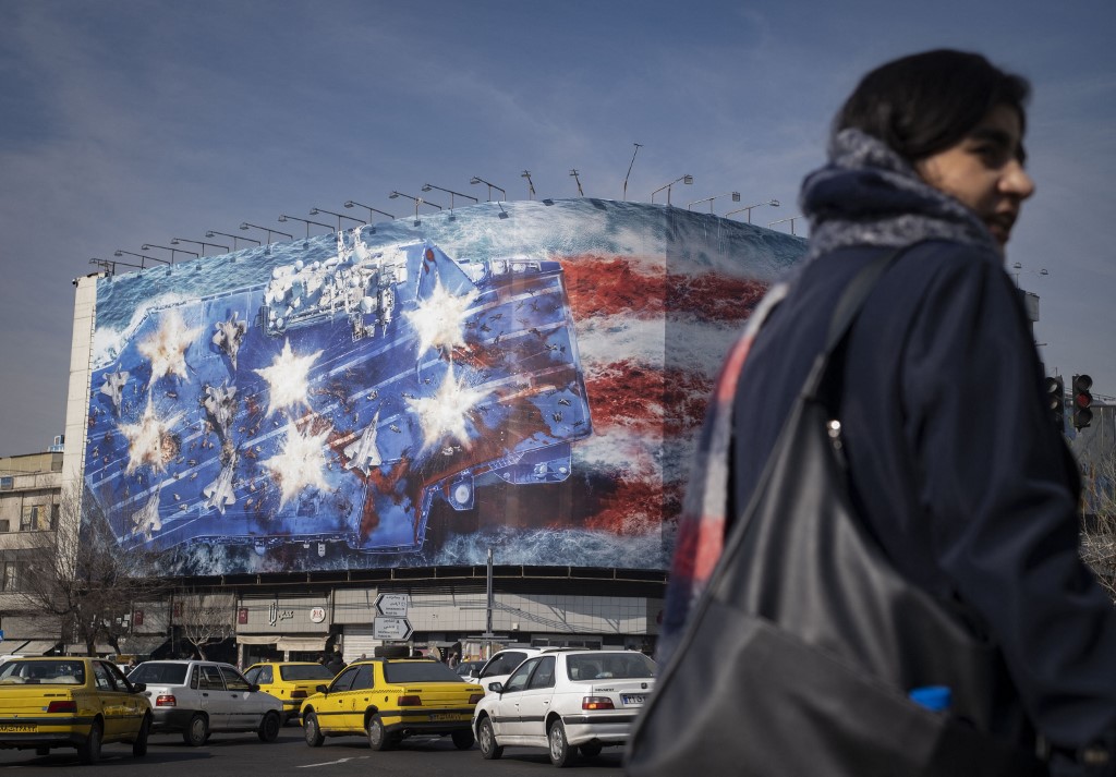 Szerdai fotó Teherán belvárosából, Az előtérben kendő nélkül sétáló FIATAL nővel, a háttérben egy propagandamolinóba burkolt középülettel. A molinó az iráni partok elé vezénylet Abraham Lincoln repülőgép-hordozót ábrázolja.