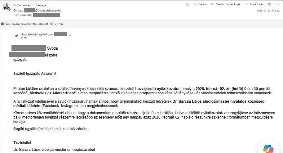 Szombat délelőtt megírtuk, hogy egy debreceni óvodában hozzájárulási nyilatkozatot kértek a szülőktől arról, hogy a gyerekeikről képek és videófelvételek készüljenek a 2026. február 02.-án (hétfő) 9 óra 30 perctől kezdődő „Medveles az Állatkertben!" című állatkerti programnapon - a nyilatkozatra azért volt szükség, hogy ezek a képek és videók megjelenhessenek Dr. Barcsa Lajos alpolgármester hivatalos közösségi média felületein.