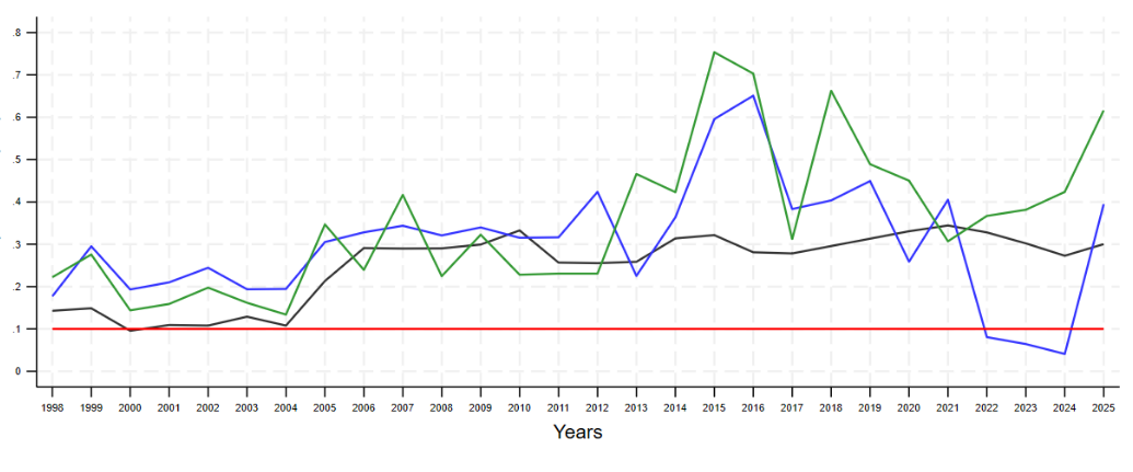 A minisztériumi közbeszerzéseknél enyhén csökkent, a védelmi célú beszerzéseknél enyhén nőtt a korrupciós kockázat 2022-2024 között, hogy aztán 2025-ben mindkét területen meredeken emelkedni kezdjen. A tavalyi első háromnegyed év végén a minisztériumoknál 0,395-ös, a katonai beszerzéseknél 0,616-os szinten volt – ez ugyebár csaknem négyszeres és több mint hatszorosa az uniós kritikus értéknek.