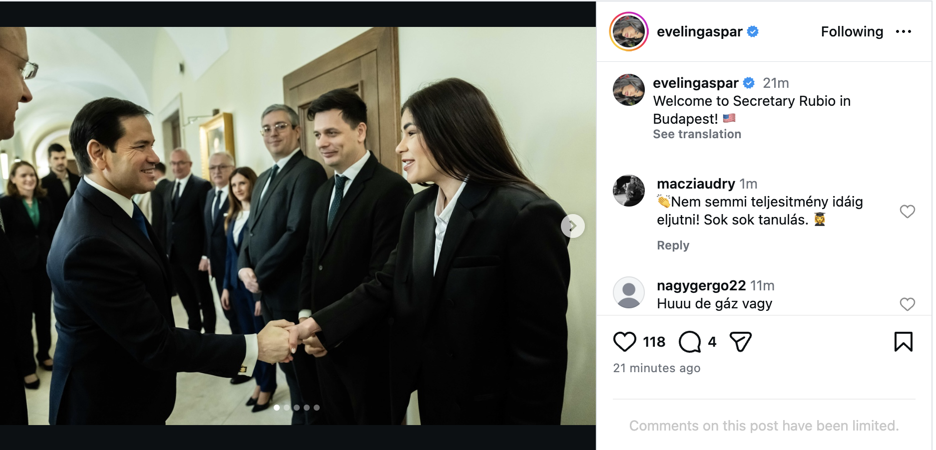 Gáspár Evelin az esemény elején történelmet írt. Ő is kezet fogott ugyanis Rubio külügyminiszterrel, majd papírra, pontosabban Instagramra vetette a következő sorokat, amik innentől fogva az Orbán-kormány diplomáciai krédóját jelentik, hiszen Gáspár hivatalosan nemcsak valóságsószereplő, de Szijjártó külügyminiszter munkatársa is: