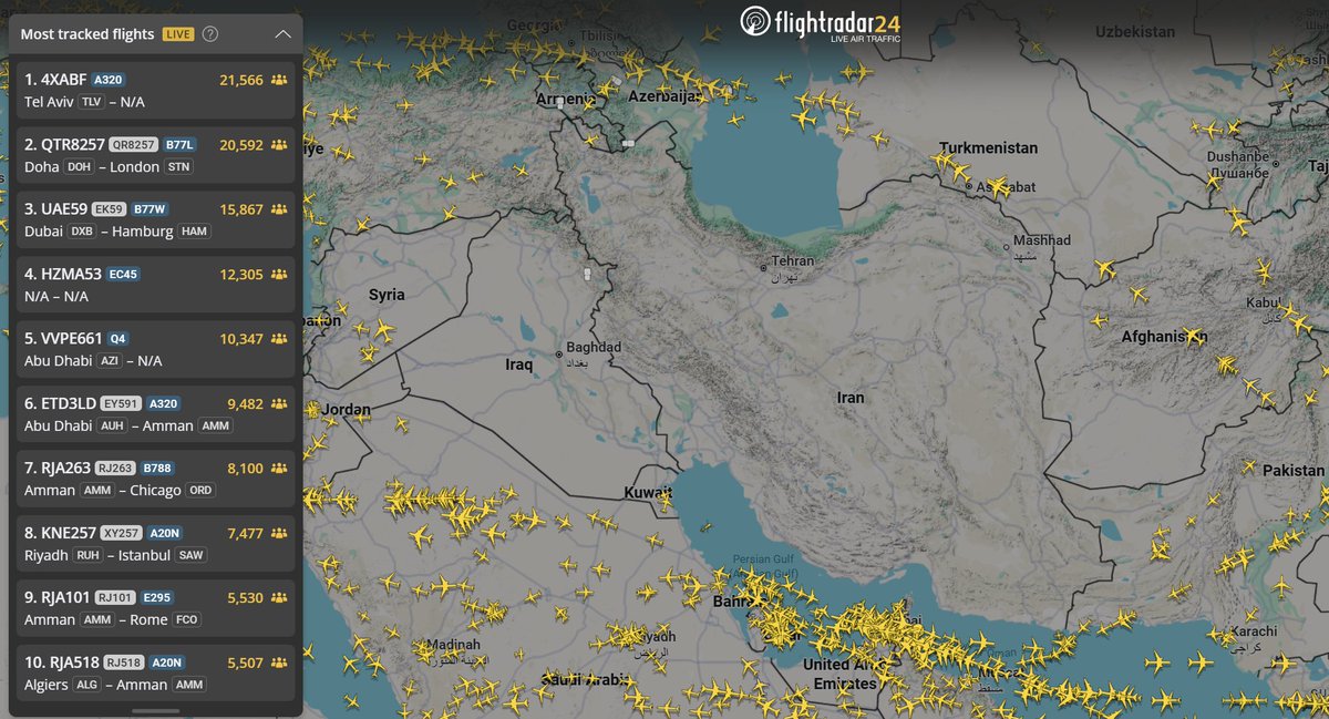 A Flightradar24 képén jól látszik, hogy a kereskedelmi járatok eltűntek Irak és Irán légteréből. A levegőben lévő járatokat új útvonalra irányították, és a több légitársaság felfüggesztette a térségbe induló, illetve onnan érkező járatait - köztük a Wizz Air is.