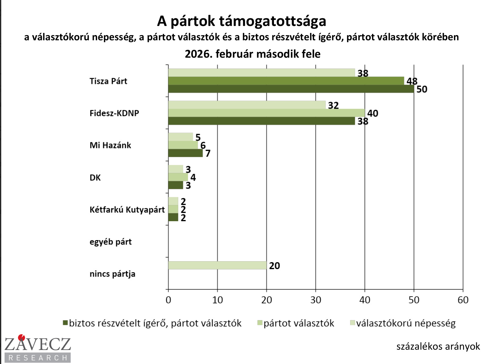 Közölte legújabb pártpreferencia-mérésének eredményét a Závecz Research. Ez alapján jelentős Tisza előnyt lehet megállapítani a biztos részvételt ígérő, pártot választók körében. Itt 50-38-ra vezet a Fidesz kihívója. Az alábbi ábrán látszik a teljes népességre és a pártot választókra vonatkozó felmérés eredménye is.