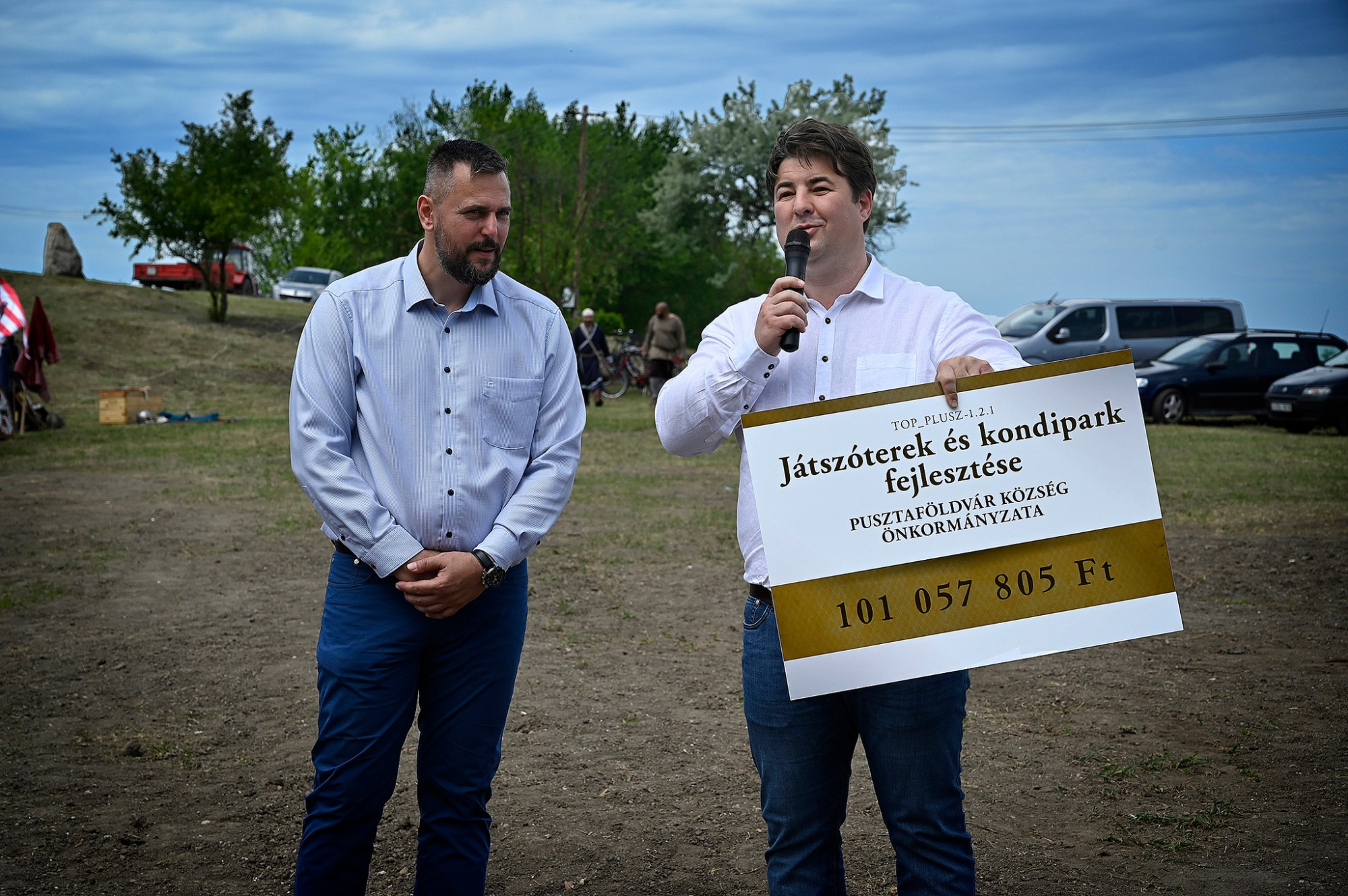 Mivel az építkezés még mindig nem indult el, Erdős az ikonikus „dolgozunk rajta” feliratú táblával pózolt az egyik játszótér leendő helyszíne előtt. Négy év alatt csak annyi változott, hogy a képviselő mellett nem Sonkolyos Szabolcs, hanem az őt 2024-ben legyőző Kaczkó Pál pusztaföldvári polgármester állt.