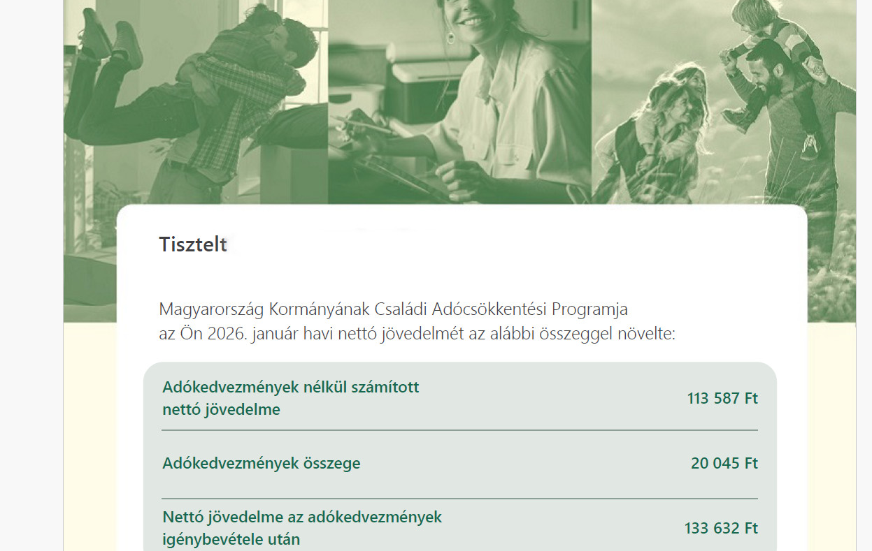 „Magyarország Kormányának Családi Adócsökkentési Programja az Ön 2026. januári jövedelmét a következő összeggel növelte:”