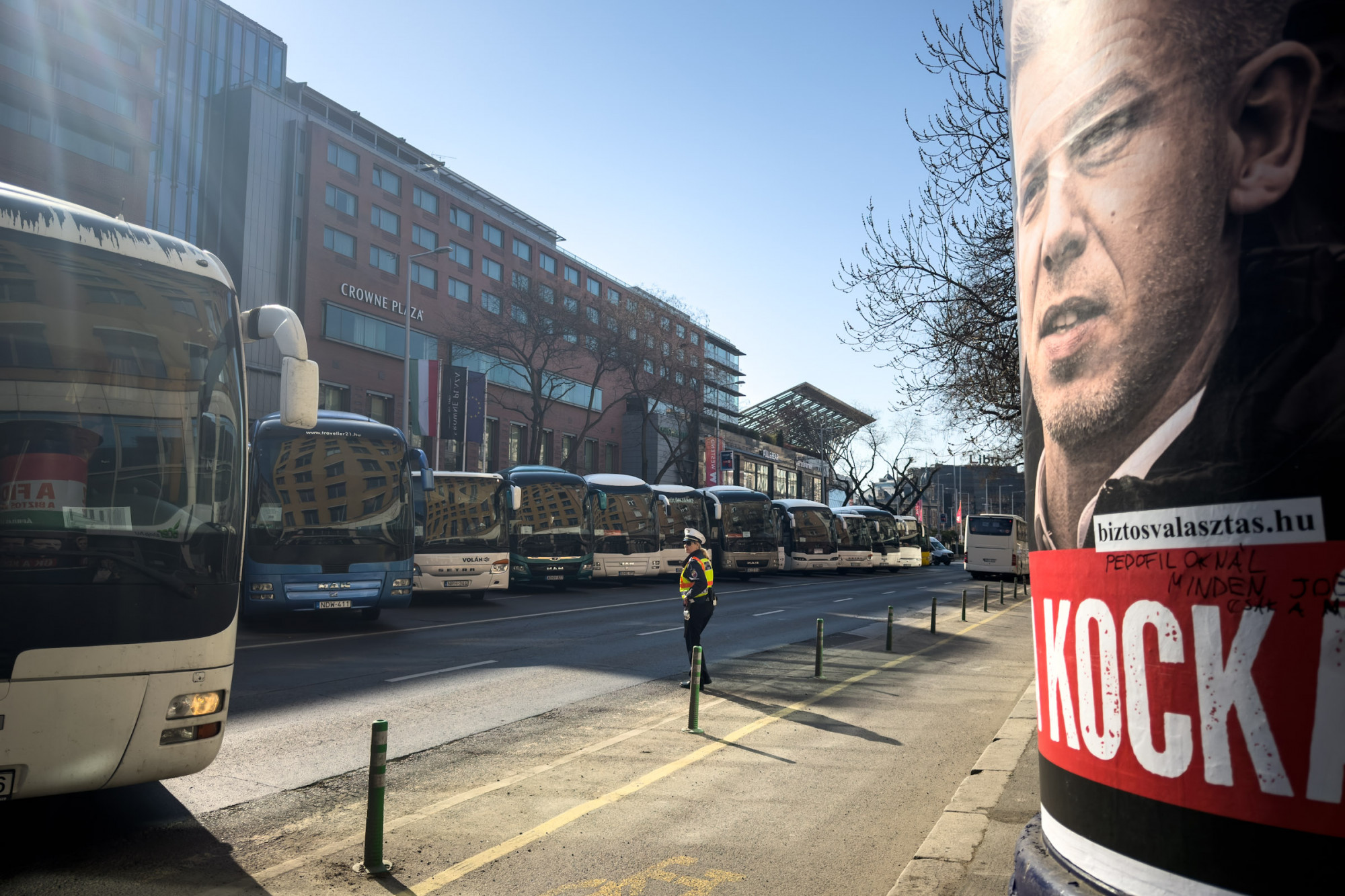 A Császár-Komjádi Uszoda elé folyamatosan érkeznek a buszok, kollégánk szerint az érkezőknek át kell menniük az uszoda előtti téren, ott felszerelik őket ingyen zászlóval és táblákkal, aztán mehetnek be a tömegbe.