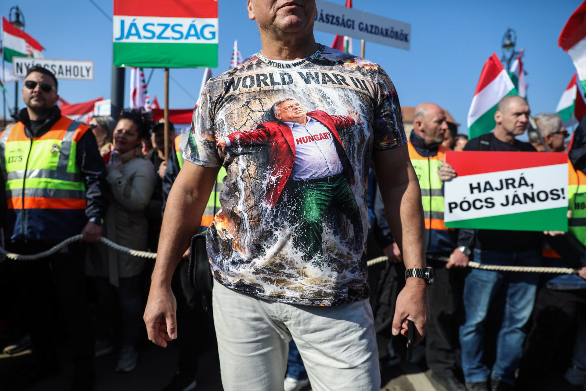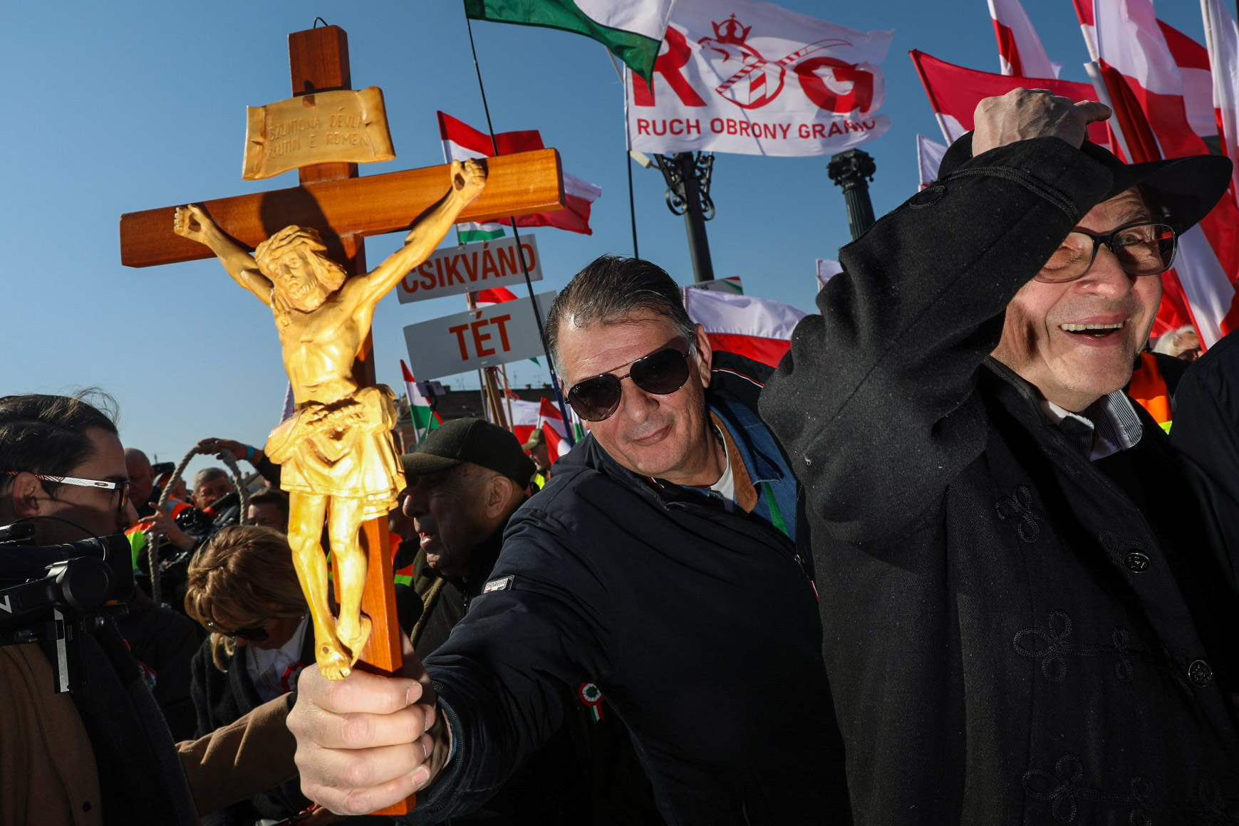 A tömegben tiszteletüket teszik a lengyel Határvédelmi Mozgalom (Ruch Obrony Granic) tagjai is. A mozgalom – amit a leírás szerint azért hoztak létre, hogy megvédje Lengyelországot a Németországból érkező illegális bevándorlással szemben – vezetője, Robert Bąkiewicz már a buszútról is posztolt videót.