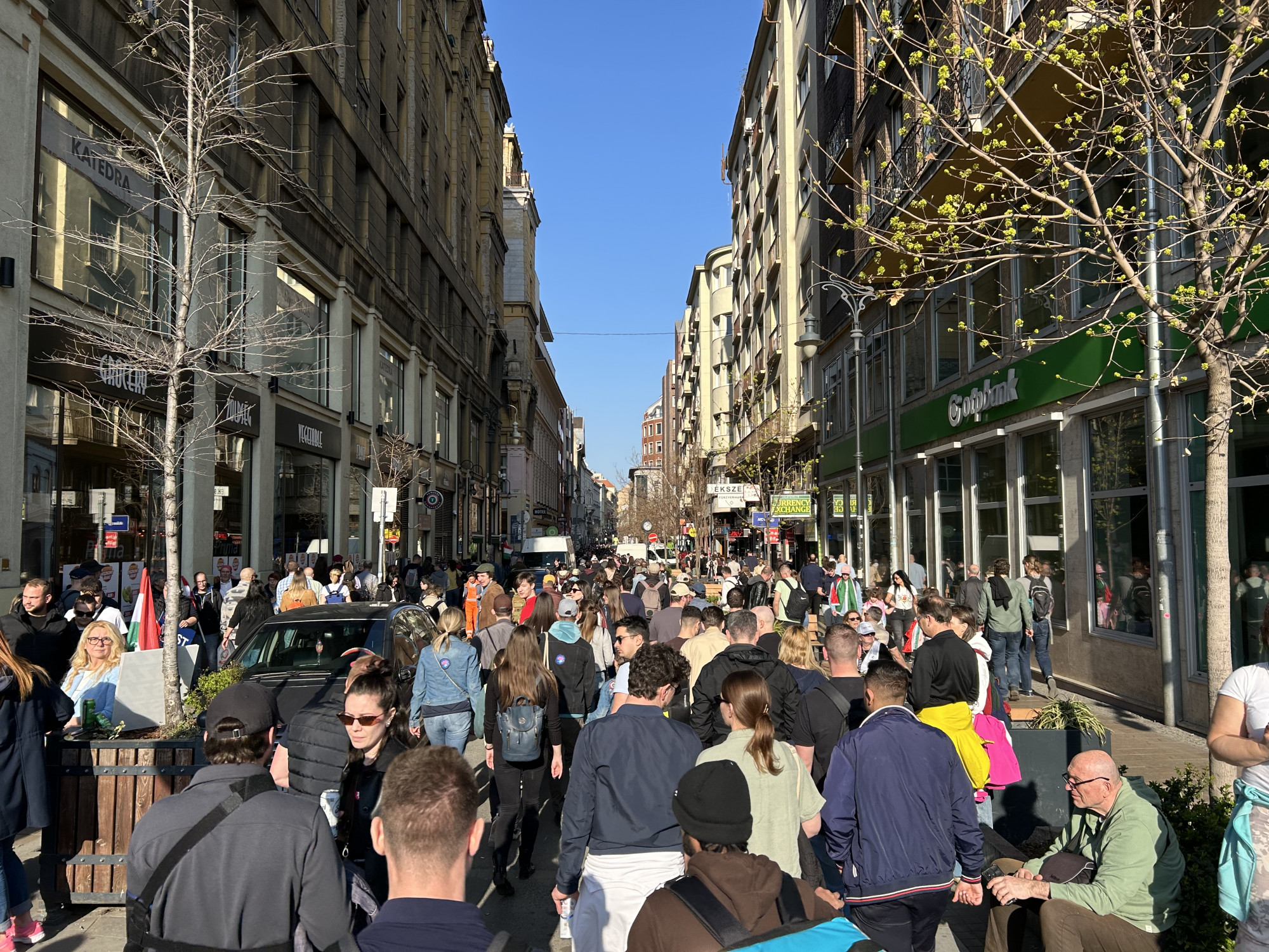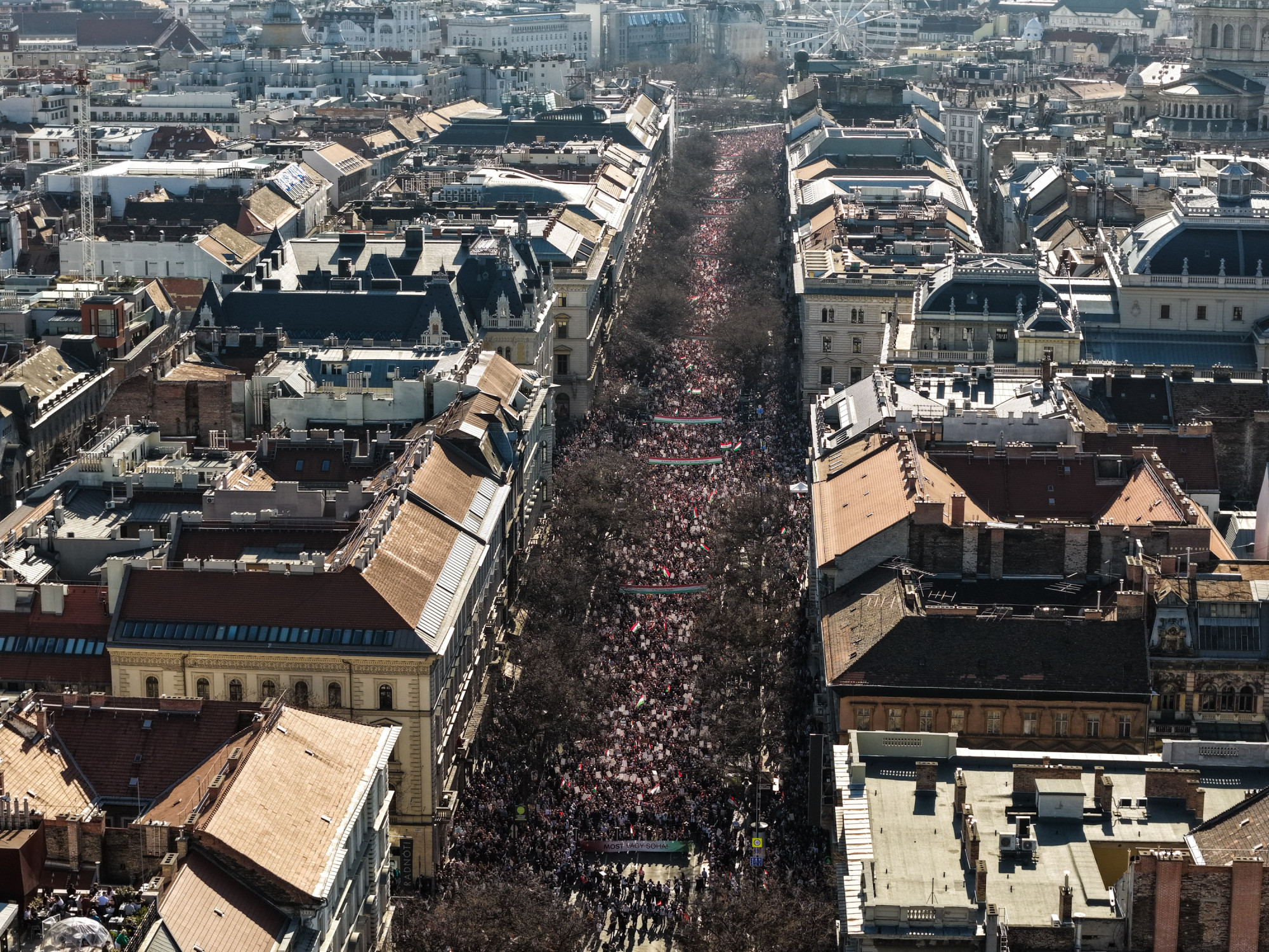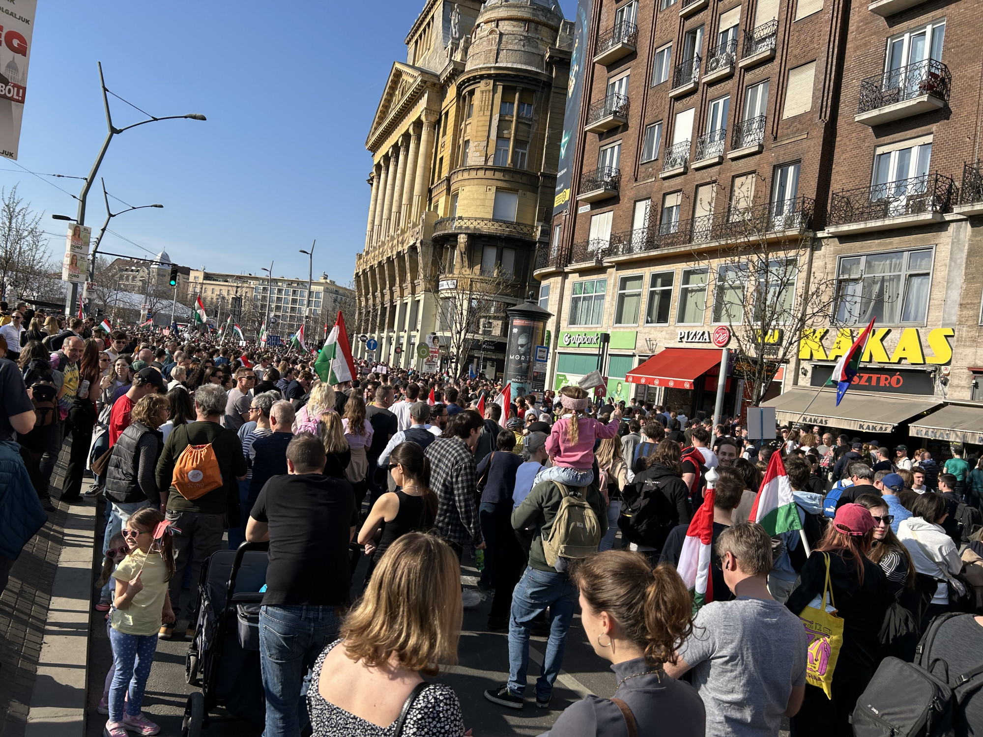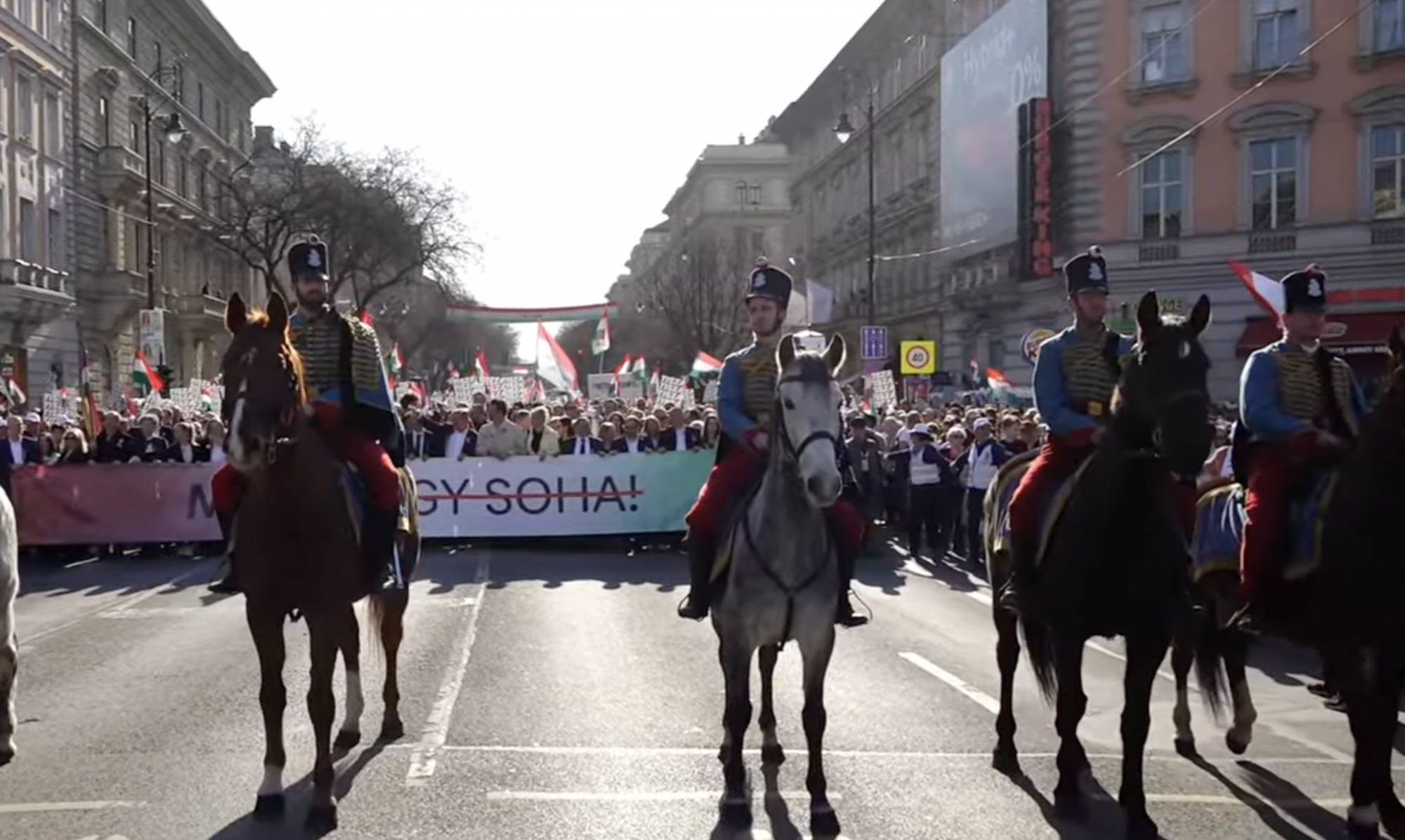 Elől halad Magyar Péter, rendezői balján Rost Andrea operaénekes, Velkey György László kabinetfőnök, jobbján Radnai Márk, Kapitány István és Nagy Ervin színész. A járdán tapsol, ujjong a tömeg, videózzák a menetet.