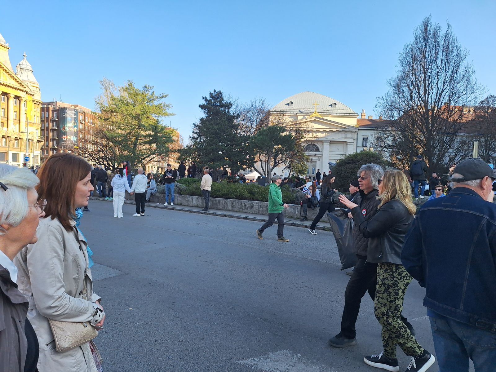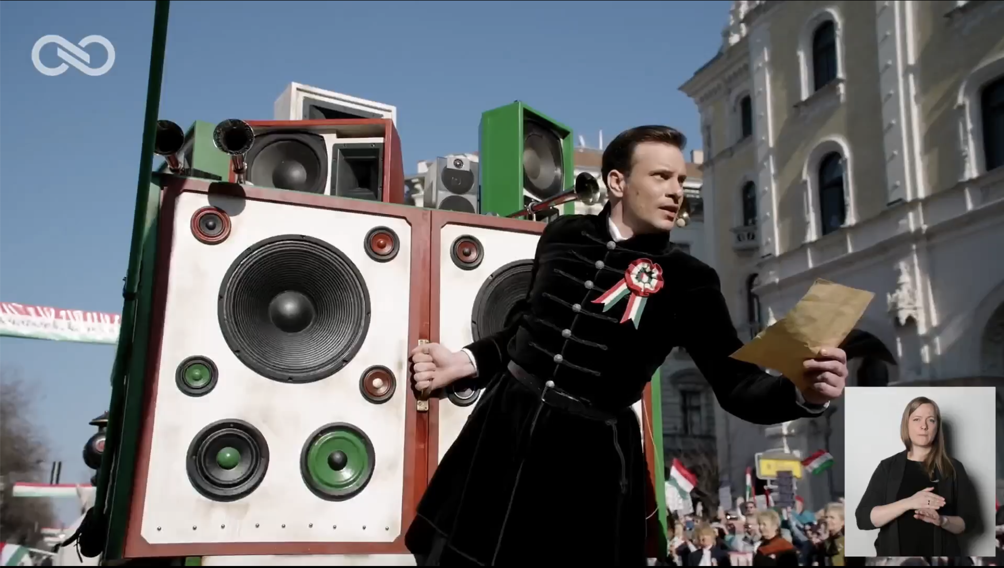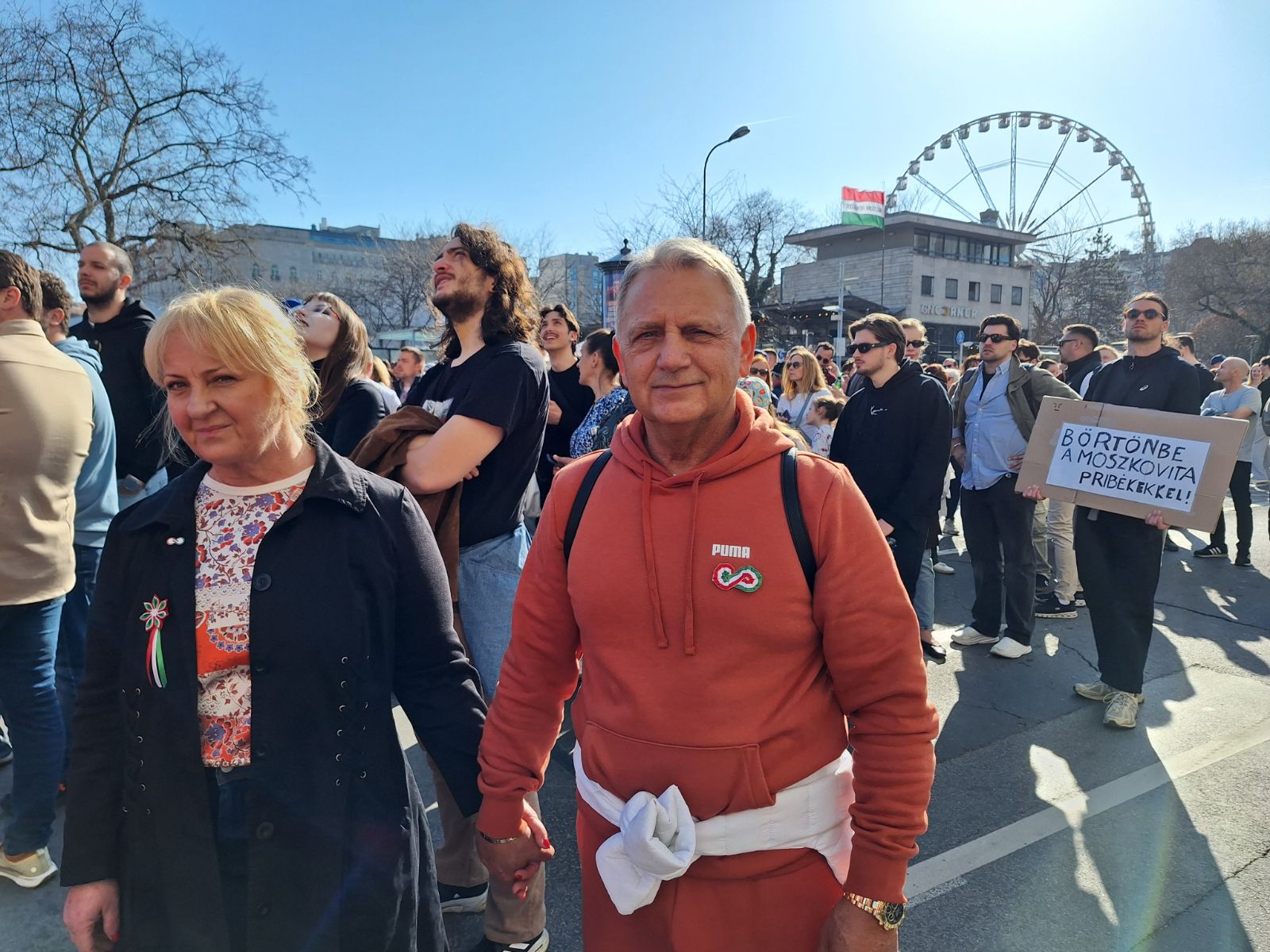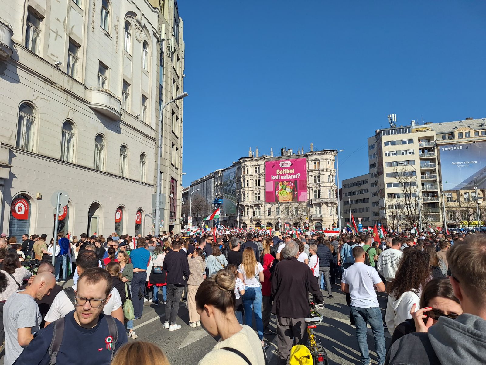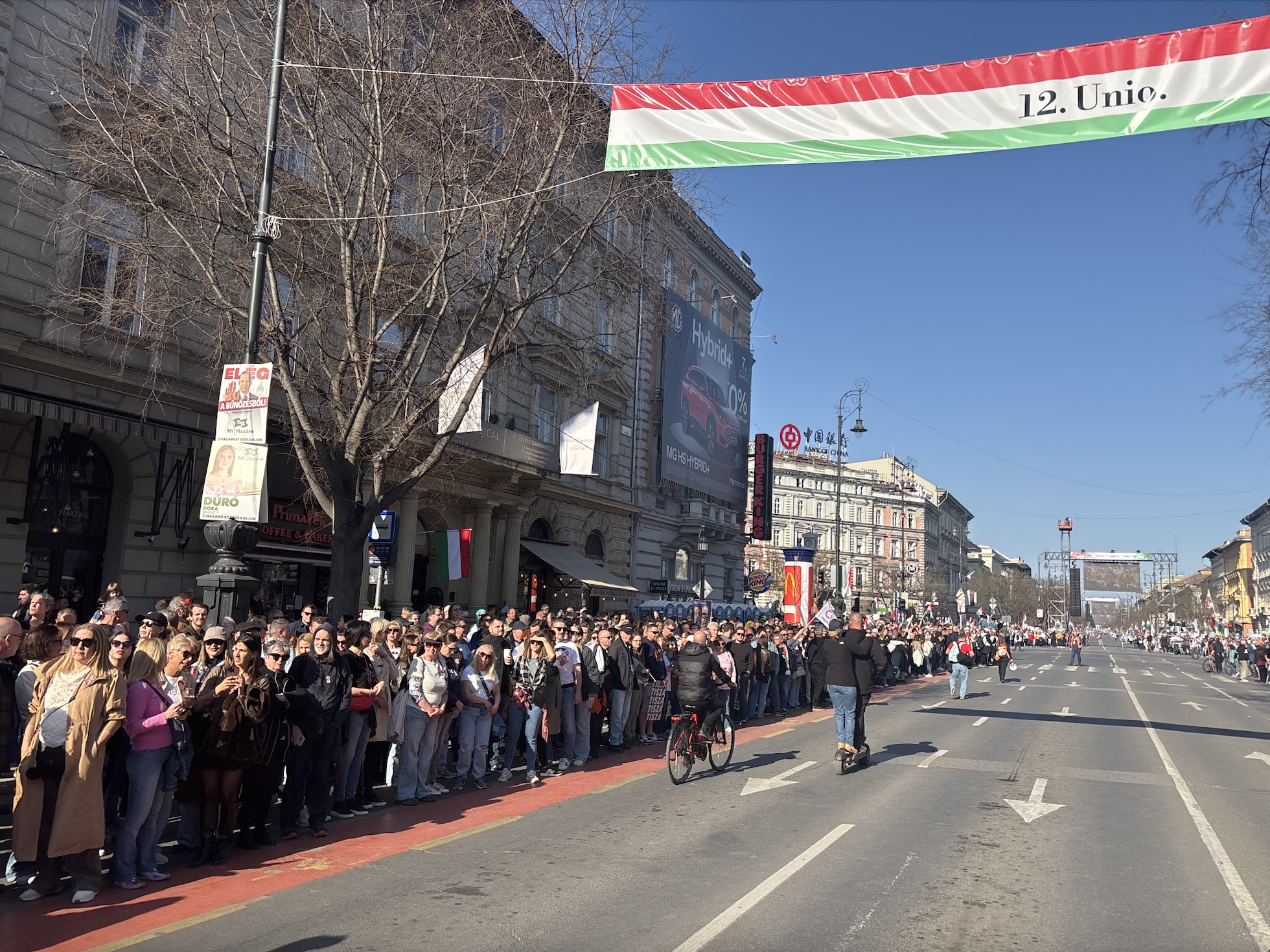 Elől halad Magyar Péter, rendezői balján Rost Andrea operaénekes, Velkey György László kabinetfőnök, jobbján Radnai Márk, Kapitány István és Nagy Ervin színész. A járdán tapsol, ujjong a tömeg, videózzák a menetet.