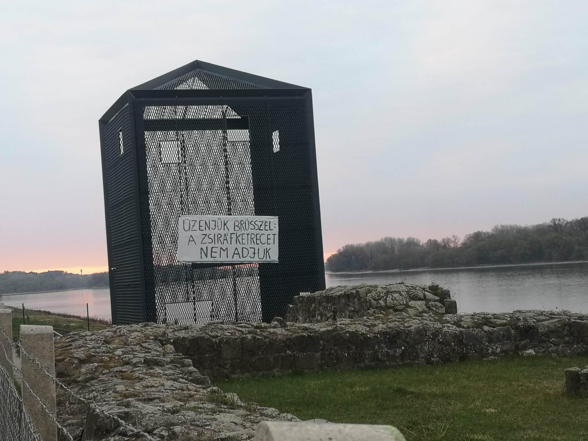 A formája miatt helyben leginkább csak zsiráfketrecként emlegetett építményen péntek reggelre aztán ez a felirat jelent meg: