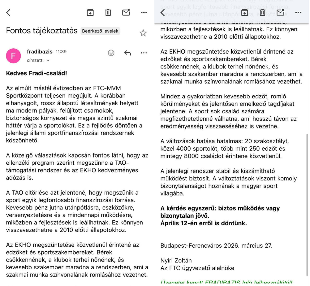 Péntek délelőtt az FTC minden dolgozója, edzője, sportolója kapott egy hivatalos emailt az egyesülettől „Fontos tájékoztatás” tárggyal. A levelet a 444 több forrásból is megkapta. A Fontos tájékoztatás valójában egy Fidesz-kampánylevél, mely hamisan azt állítja, a Tisza csökkentené a sporttámogatásokat, adót emelne, és így az edzők elveszíthetik állásukat, ha nem a Fidesz nyer. A levelet megkapták a kiskorú sportolók szülei is, akár tízezer emberhez is eljuthatott az üzenet. Az FTC elnöke Kubatov Gábor, a Fidesz alelnöke, pártázgatója és fontos kampányszervezője.