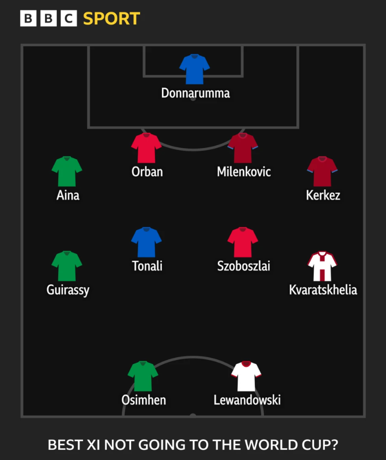 Donnarumma (olasz) - Aina (nigériai), Willi Orbán, Milenkovic (szerb), Kerkez Milos - Guirassy (nigériai). Tonali (olasz), Szoboszlai Dominik, Kvaratskhelia (grúz/georgiai) - Osimhen (nigériai), Lewandowski (lengyel)