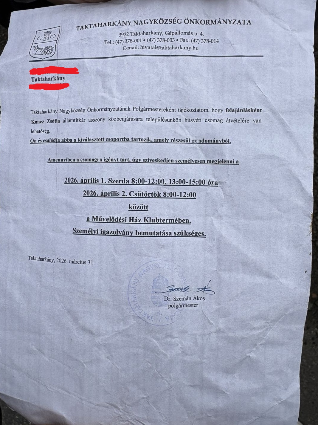 A 444 birtokába került, Szemán Ákos taktaharkányi fideszes polgármester által jegyzett értesítő levelet március 31-én dobták be a postaládákba. A névre szóló dokumentumban azt írták, hogy felajánlásként, Koncz Zsófia államtitkár „közbenjárására” húsvéti csomagot osztanak a településen.