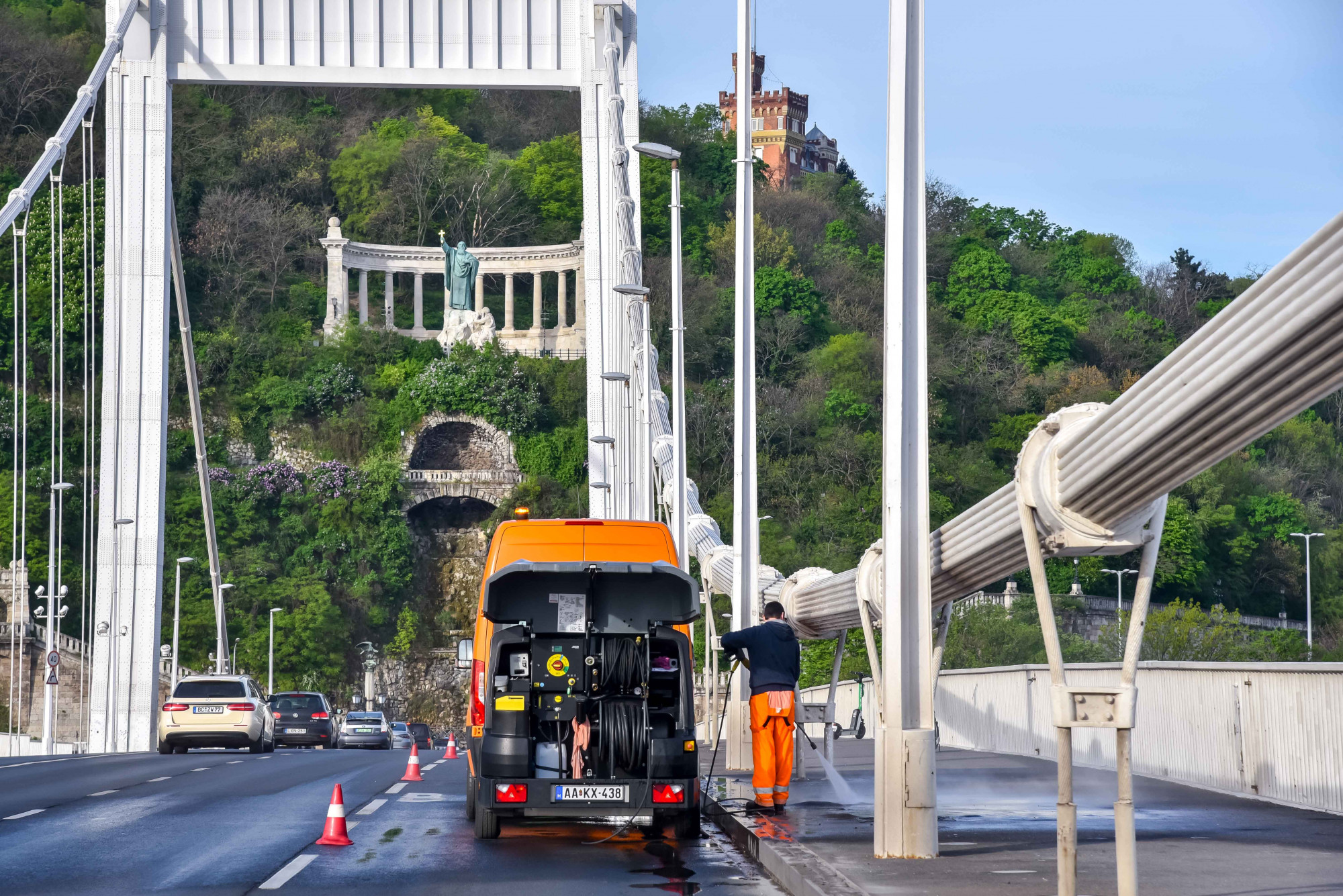 Az Erzsébet híd lesz az első, április 4-én (szombaton) 6:30 és 13:30 között a déli, április 5-én (vasárnap) pedig az északi oldalát tisztítják majd környezetkímélő tisztítószerrel, magasnyomású, vizes technológiával.
