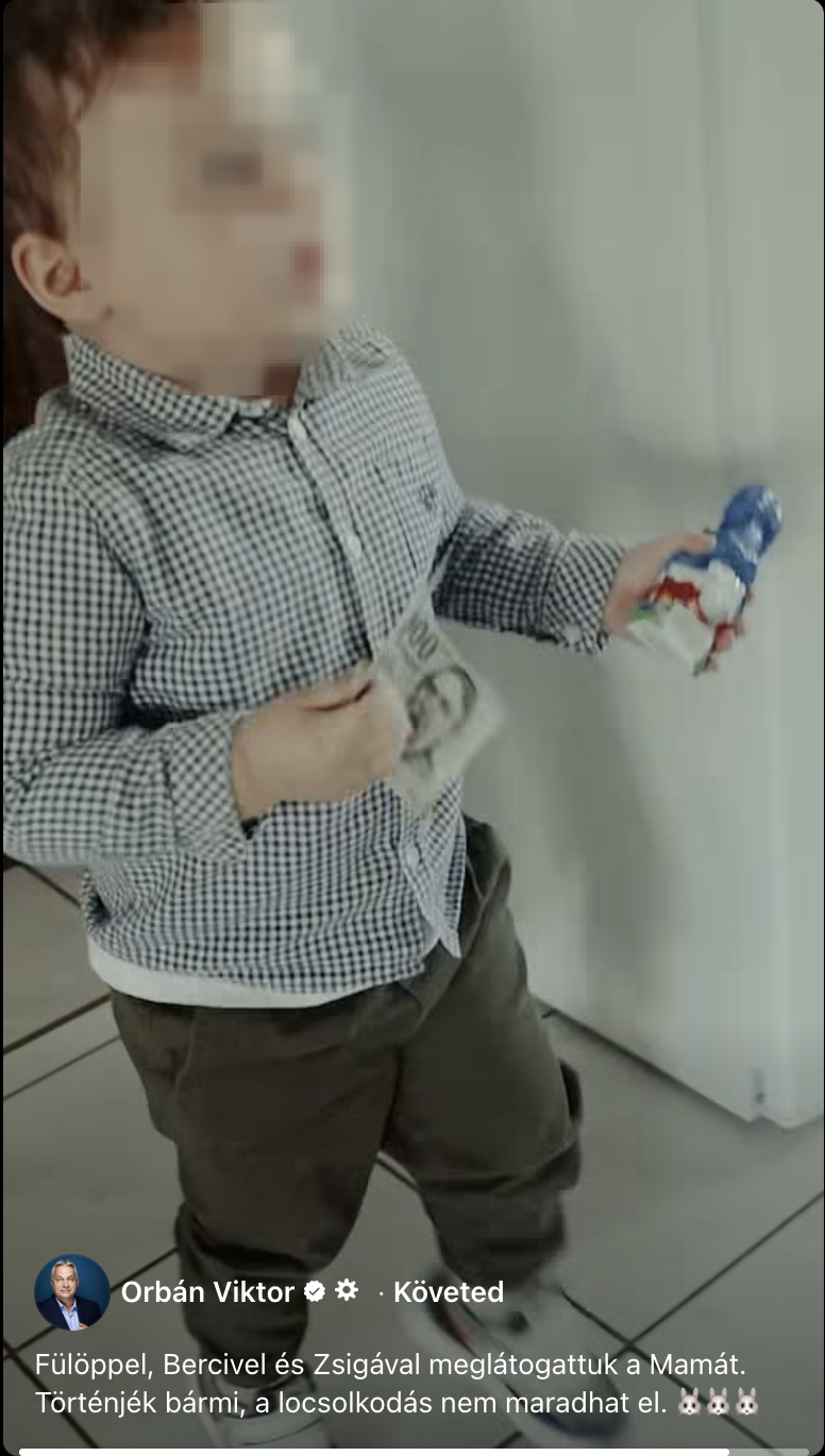 Locsolkodni ment fiúunokáival Orbán Viktor. A miniszterelnök az édesanyját látogatta meg T. Bertalannal (6), Sz. Fülöppel (6) és Sz. Zsigmonddal (2,5), erről maga Orbán tett ki egy videót. Mindhárom gyerek annak rendje és módja szerint elmond egy-egy locsolóverset, és meglocsolják dédnagymamájukat. Ő ezért cserébe ad piros tojást és csokinyuszit is a gyerekeknek, ám az egyik vágóképen már az is látszik, hogy a 2,5 éves Zsigmond egyik kezében nem a piros tojással, hanem egy húszezressel szaladgál. Az legalább nem tud összetörni. Később Fülöp kezében is villan a húszas, csak remélni tudjuk, hogy Bertalannak is jutott némi locsolópénz.