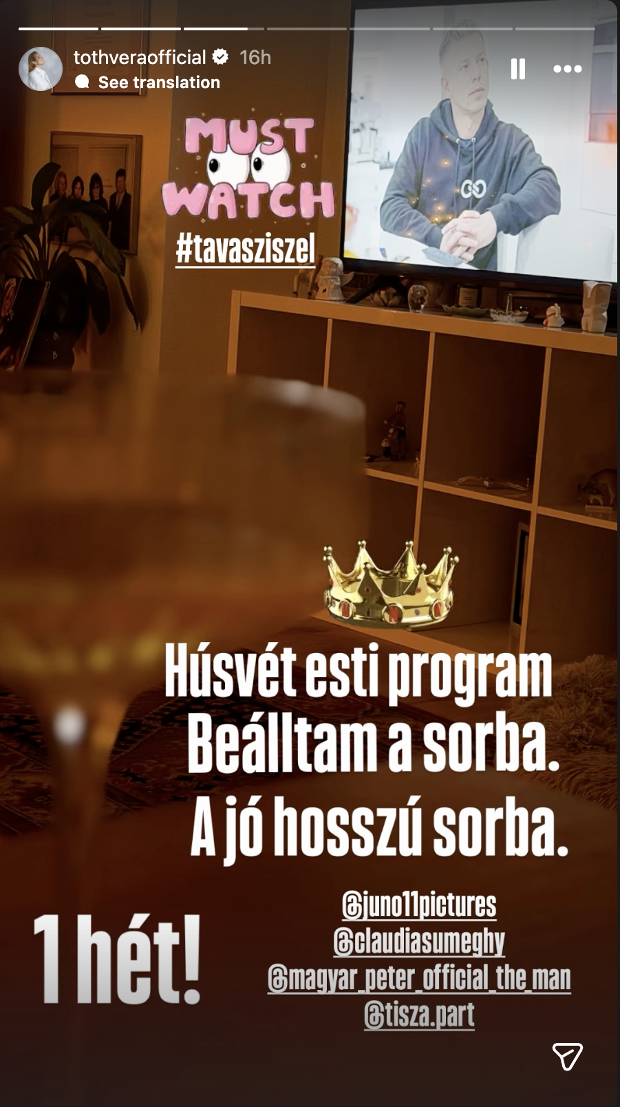 Instastoryt posztolt Tóth Vera énekes arról, hogy megnézte a Tavaszi Szél című, Magyar Péterről szóló filmet. Tóth szerint a filmet kötelező megnézni (must watch), és azt is ráírta a képre, hogy: „1 hét!”