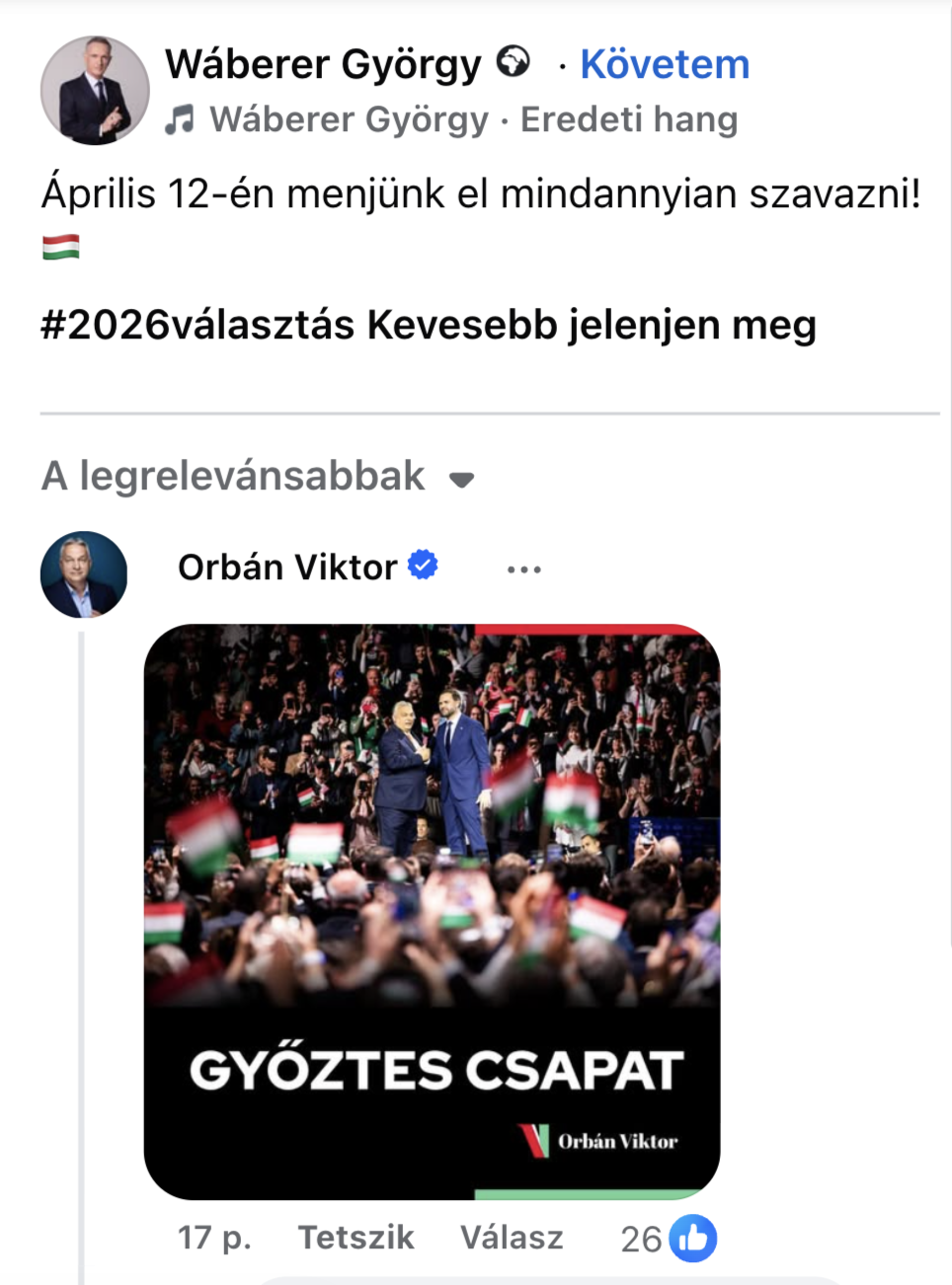 18:48 - Frissítés: Orbán Viktor a választás előtt öt nappal Magyar Péterhez hasonlóan kommentelésre adta a fejét, és úgy döntött, Wáberer György posztja alatt fejti ki a véleményét, hogy közölje, szerinte ki a győztes csapat. Ezt egy J.D. Vance-szel közös fotóval illusztrálta: