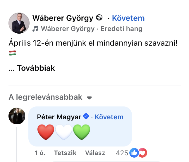 19:55 - Frissítés: Magyar Péter is kommentelt Wáberer posztja alá, ő csak három szívet írt, pirosat, fehéret, zöldet.