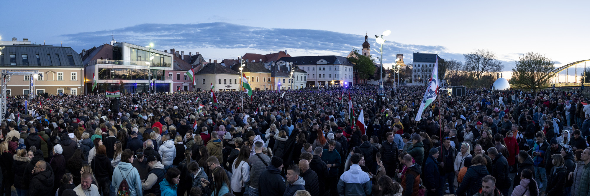 Három nappal az országgyűlési választások előtt Magyar Péter az Észak-Dunántúlt dolgozta meg. Balatonfüreden kezdett 11-kor, aztán Sümeg, Sopron, Mosonmagyaróvár, és végül Győr. Este 6 körül már rengetegen vannak a téren, pedig Magyar ekkor még Mosonmagyaróváron beszélt. Megtelnek a környező teraszok, bankot robbant ma a kávézó, a fagyizó, a pizzás.