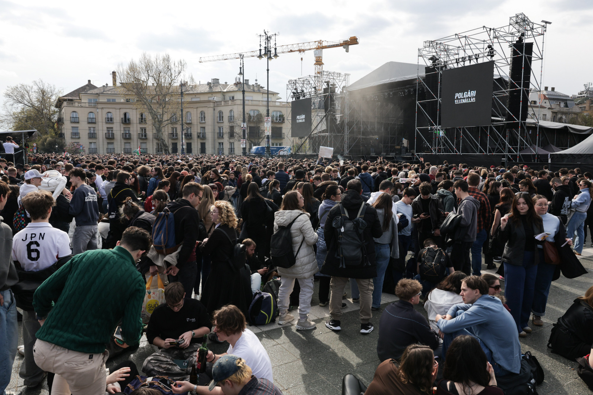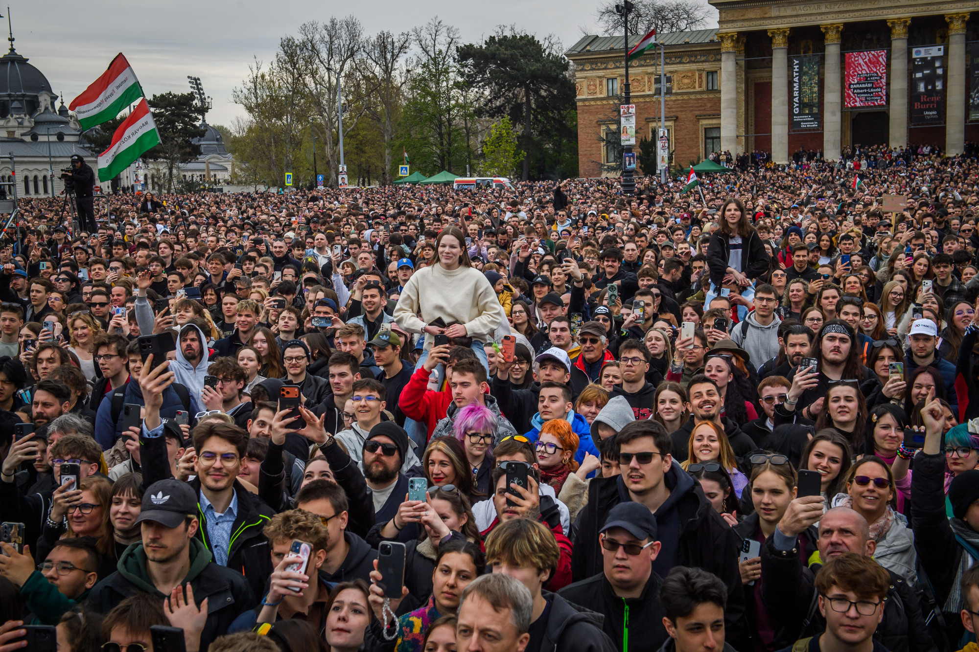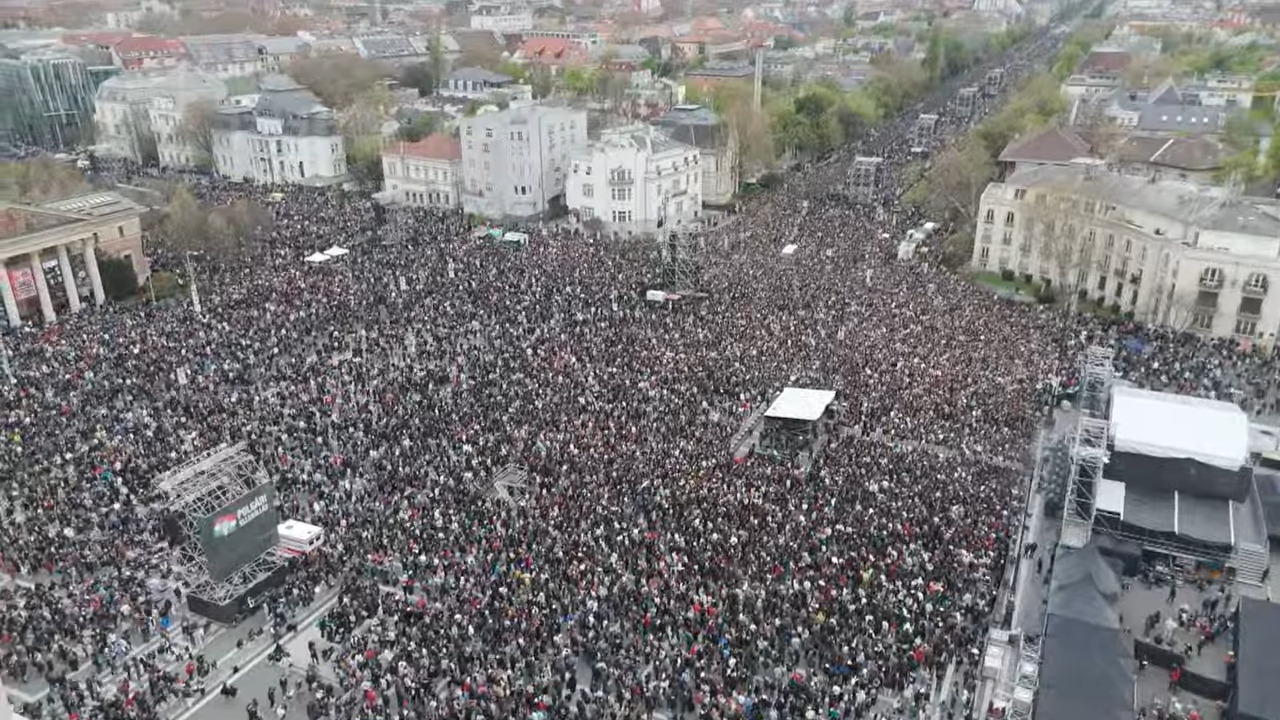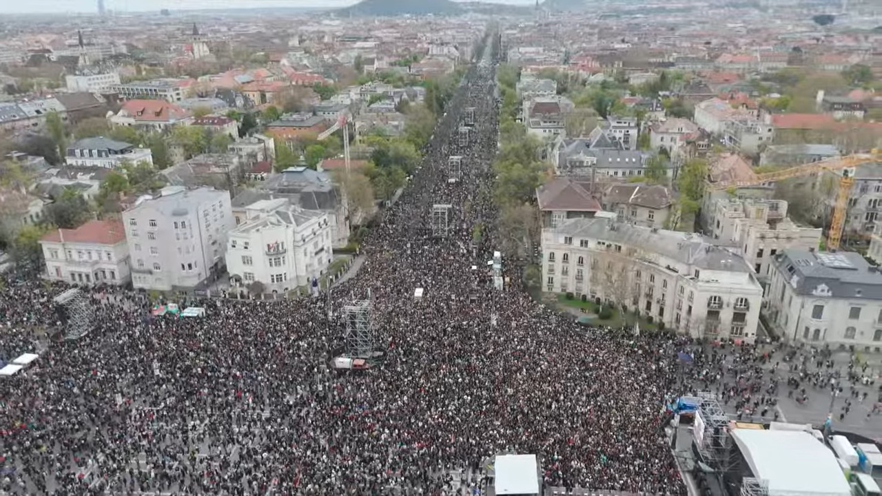 A teret egyre nehezebb megközelíteni, jelentették a város több pontjáról munkatársaink. A helyszínen lévő kollégánk fél hat körül arról számolt be, hogy „durván sokan vannak a téren”. A kamerák totálképei szerint a tömeg legalább akkora, mint a Tisza március 15-i rendezvényén voltak, a Kodály köröndig lényegében beállt a sugárút.