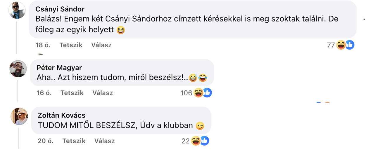 Bár mentális egészségem védelmében az esetek legnagyobb részében kínosan ügyelek, hogy ne olvassak kommenteket, most kivételesen mindenkit bátorítanék a Németh Balázs posztja alá érkező kommentek elolvasására, becsatlakozott ugyanis többek közt A Másik Magyar Péter, A Másik Csányi Sándor és A Másik Kovács Zoltán is.