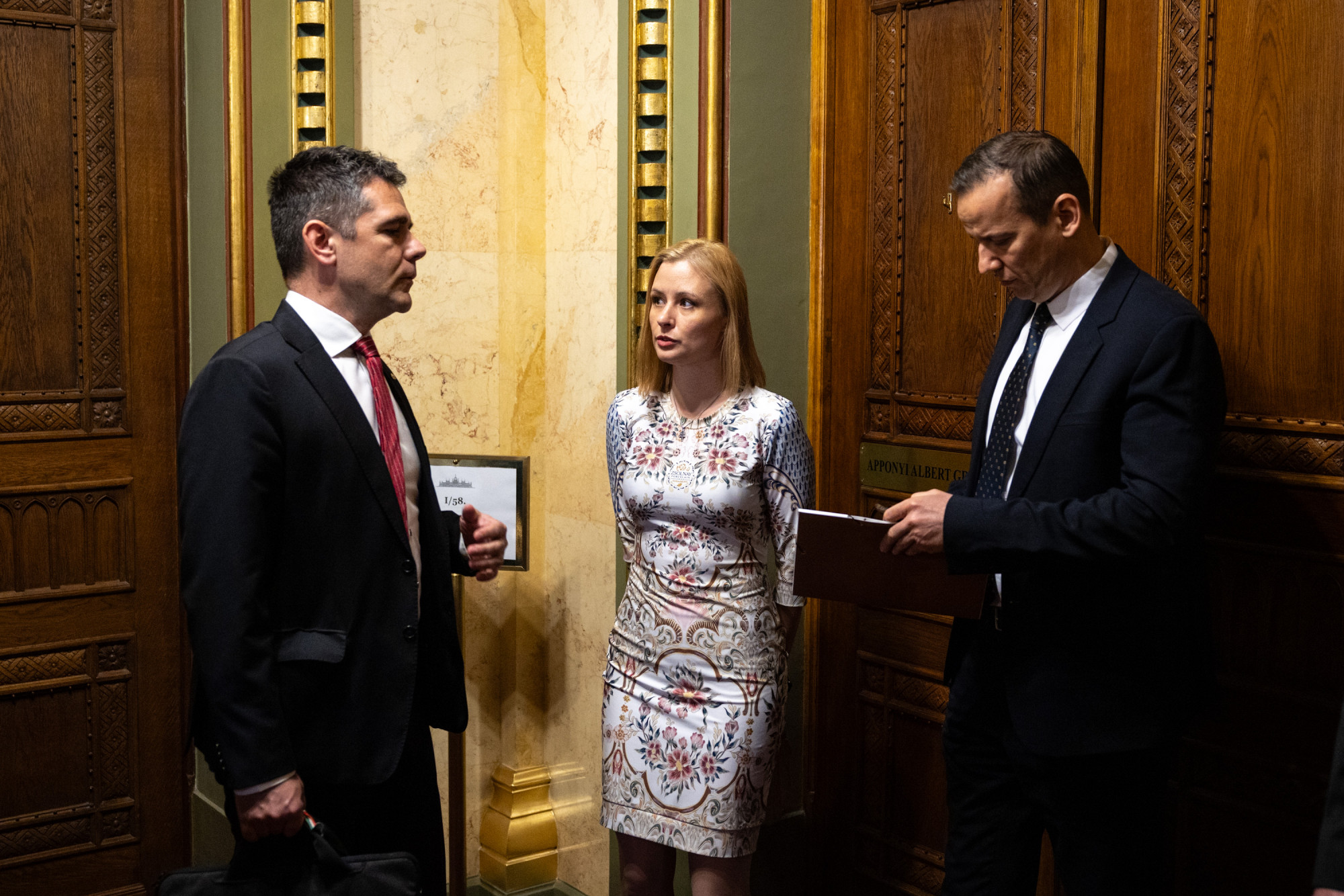 Az alakuló ülés részleteiről több mint másfél órát egyeztettek a pártok képviselői. A Fidesz Gulyás Gergelyt küldte, aki kezet is fogott Magyar Péterrel.