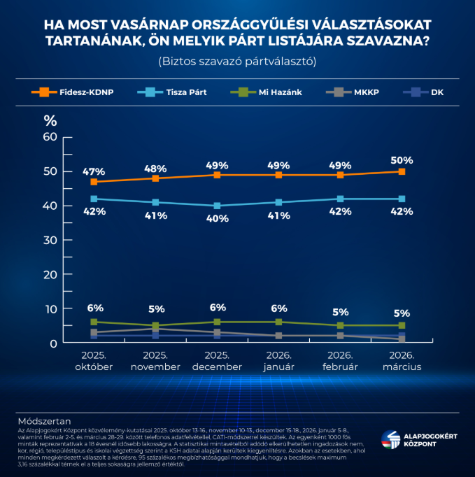 A Központ a kampány során végig 40-42 százalékra mérte a Tiszát, és folyamatos emelkedés mellett márciusra 50 százalékra a Fideszt.
